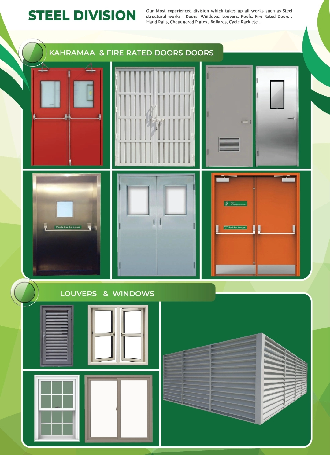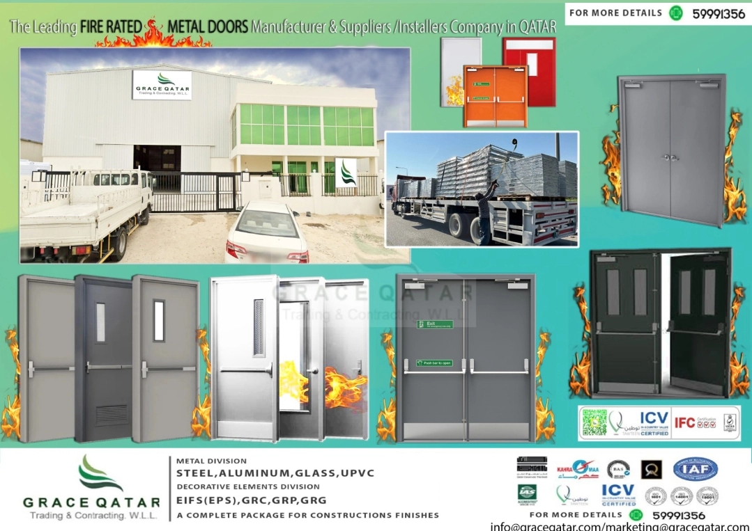 All kind of metal works ( FRD /NFR STEEL DOORS MANUFACTURING PLUS SUPPLY AND INSTALLATION, STRUCTURAL STEEL WORKS, ALUMINUM,UPVC WORK, DELUGE CABINETS, HANDRAILS, STAIRCASE, FABRICATION WORKS,) GRC,GRP, GRG,EIFS WORKS.( marketing@graceqatar.com- 59991346)