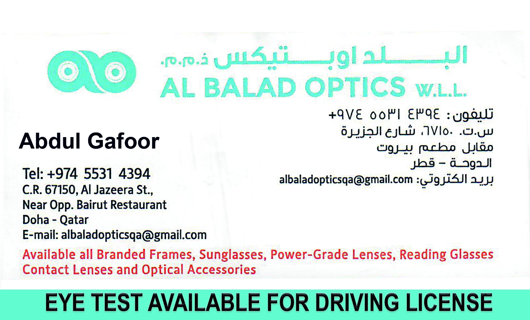 Al Balad Optics W.L.L. offers premium eyewear and professional eye care services in Qatar. Explore prescription glasses, contact lenses, and designer sunglasses with expert vision testing.